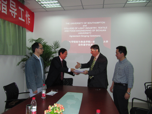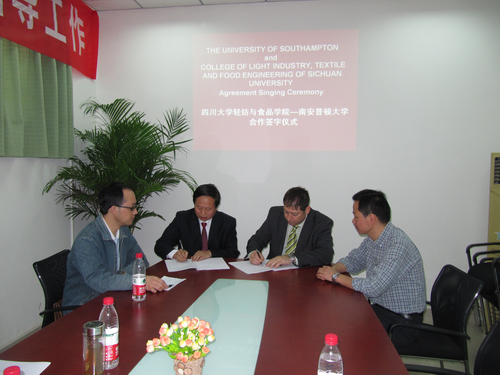 2011年5月24日,四川大学轻纺与食品学院与英国南安普敦大学(The Southampton University)联合培养人才的合作协议在我院正式签署,该合作协议的签署标志着我院在人才培养的国际间交流与合作方面取得了重要进展。我院主管本科教学副院长何强教授、纺织与服装系服装教研室主任张皋鹏副教授参加了签字仪式。