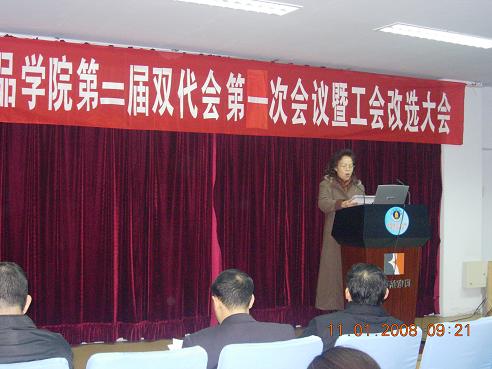 轻纺与食品学院第二届双代会第一次会议及工会改选大会胜利召开 2008年1月11日,轻纺与食品学院召开了第二届双代会第一次会议及工会改选大会,学校工会主席蒋润书,副主席蒙慧玲、唐宏光,民主建设科科长黄伟参加了会议。校工会主席蒋润书代表学校工会祝贺我院双代会的召开,肯定了我院工会工作和创建“教职工之家”的成绩,并对今后工会工作提出了几点建议。 学院党委书记刘学文代表学院党委致辞,祝大会圆满成功。全体代表认真听取和审议了院长陈武勇的学院工作报告和财经工作报告,院工会主席华坚的双代会报告,并分组讨论了以上三个报告,认为报告实事求是,客观全面,并一致通过。希望工会在民主建设、民主监督、民主管理等方面充分发挥作用,为实现我院 “在校内率先建成国内一流、国际知名的研究型学院”和实现学科再创辉煌的目标做出贡献。 会议还选举产生了新一届的院工会委员会。