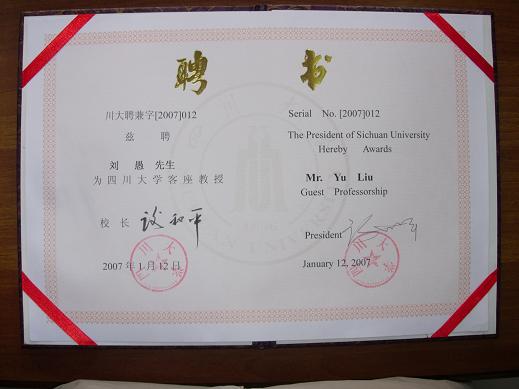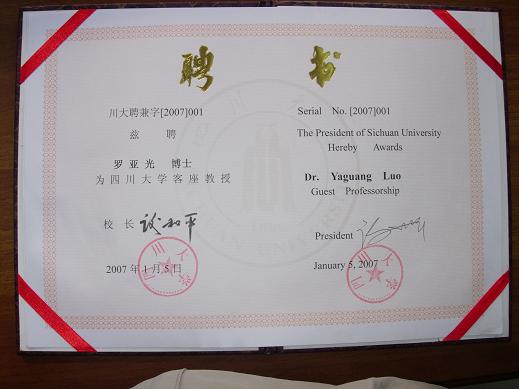 我院聘请两位客座教授 根据我院食品学科的发展需要,经四川大学批准,聘请罗亚光博士和刘愚先生为四川大学客座教授。