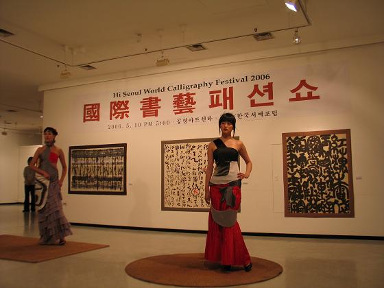 “2006世界书艺祝祭”由“韩国美术协会书法分科”、“韩国书法协会及“韩国书家协会”等3个团体共同组办,参会者有来自中国(包括台湾地区)、韩国、日本、马来西亚、法国和美国等国家的书法艺术家,于会期间同时举办了书艺作品展览。此次会展不仅促进了世界书艺表现手法的创新,还拓展了服饰设计新的创作领域。