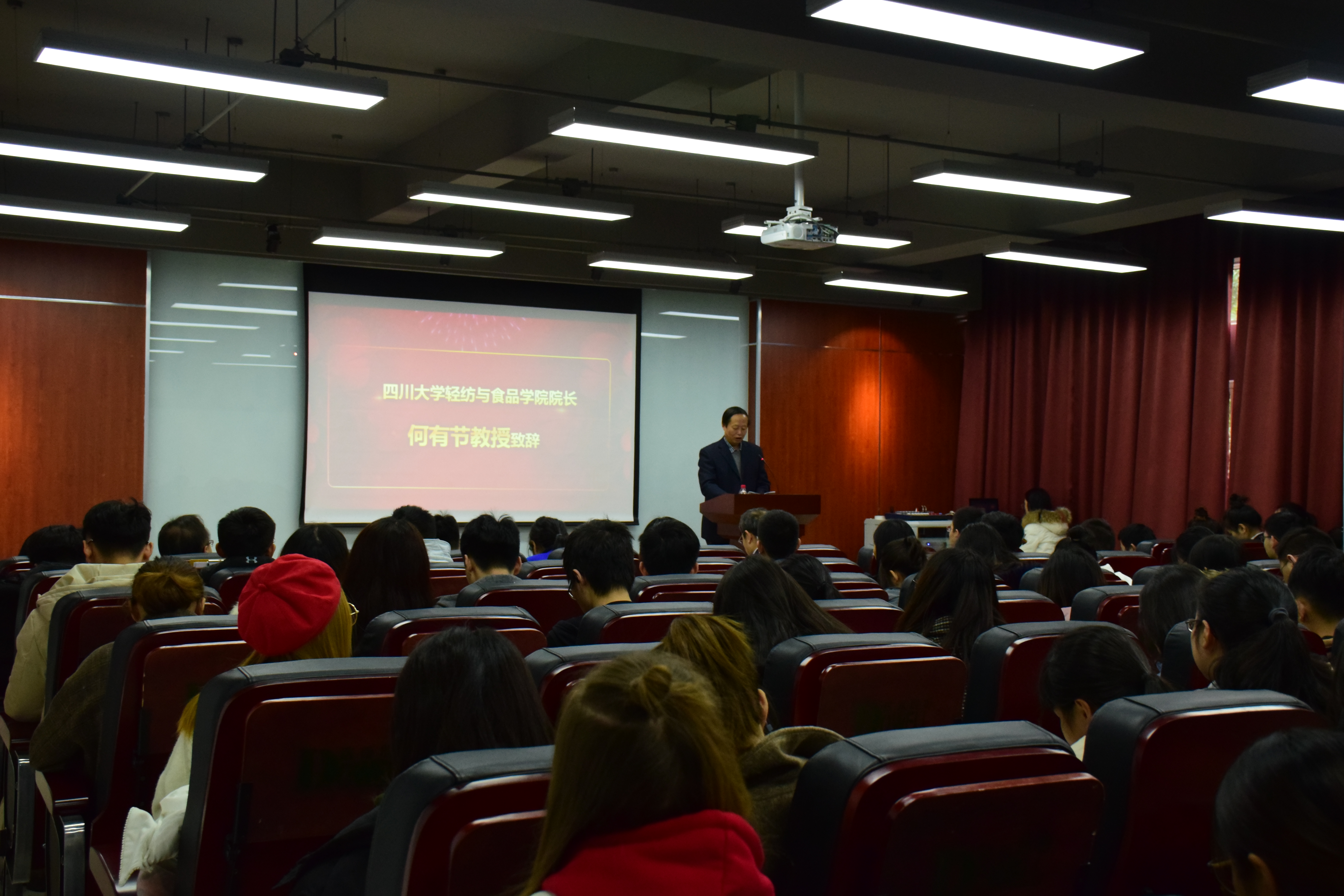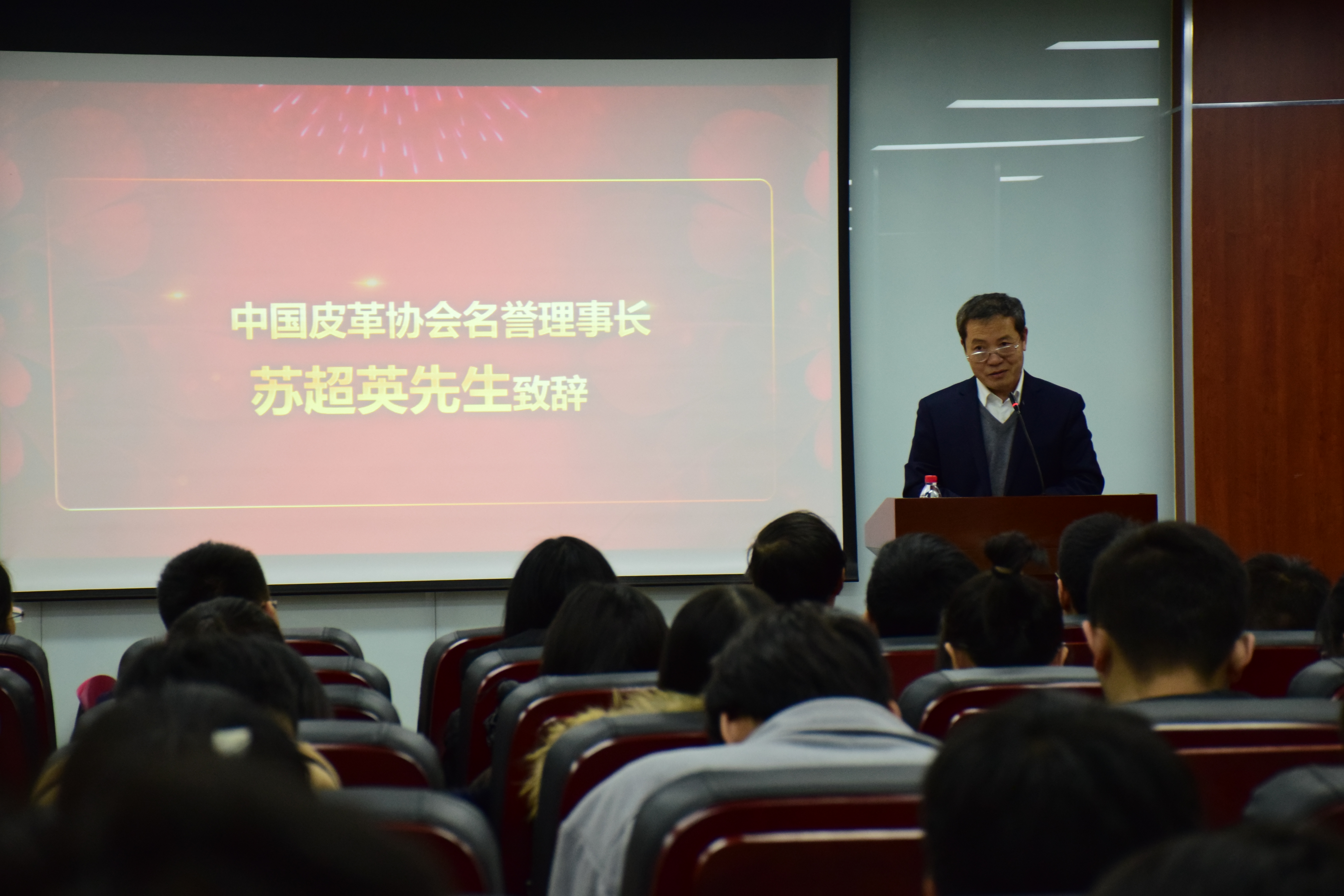 下午14:30,颁奖典礼正式开始,本次颁奖典礼由2015级辅导员贺婷老师主持。在颁奖典礼正式开始前,以视频短片的方式回顾了近十年生物质与皮革工程系专业奖助学金的设置及颁奖情况,让全场嘉宾与同学们对行业、企业及校友长期以来对我校人才培养的支持与鼓励有了全面的认识与了解。随后,何有节院长首先致辞,何院长代表轻纺与食品学院及生物质与皮革工程系感谢设奖单位、个人及专程到成都参加颁奖典礼的各位嘉宾,感谢他们对我院教育改革的关心与支持,感谢他们对川大学子的支持与鼓励,也对获奖同学表达了衷心的祝贺。何院长向各位嘉宾与同学详细介绍了生物质与皮革工程系近年来的教育教学、学科特点以及与行业企业交流合作开展情况。同时,何院长也对同学们提出了几点期望:第一、希望同学们珍惜荣誉、再接再厉、百尺竿头、更进一步。继续发扬拼搏精神,从现在开始,戒骄戒躁、诚信创新、刻苦钻研,努力提高自身素养,保持良好的学习风气和学习热情,取得更好的成绩,以回报支持和关心我们的行业主管部门、国内外企业,回报社会各界的厚爱与关怀。第二、希望同学们学会学习、锻炼能力,做好服务社会的准备。第三、希望同学们热爱所学专业,注重自己综合能力的培养。让每个同学成为既掌握扎实的专业知识,又有较高综合能力的复合型人才,以适应社会发展需要。第四、发奋成才、立报国志,感恩党和政府,感恩人民和社会。同学们要常怀感恩之情,永存奉献之心,学会善待他人,回报社会。同时,设奖单位代表中国皮革协会名誉理事长苏超英先生致辞。苏理事长回顾了中国皮革协会奖学金设立的历史,欣慰的看到一代又一代皮革学子在热心人才培养的行业企业和协会资助和鼓励下学有所成、学有所用,在行业内大有所为,众多科技成果受到国际社会的关注与认可,成为行业发展的中坚力量。因此,苏理事长也对同学们提出殷切希望:希望大家夯实基础、勤奋学习、广收博览、勤于思考;希望大家坚定信念、怀抱理想、明确目标、修德励能;希望大家脚踏实地、细微着手、步伐稳健、善于实践;更希望大家能够肩负起未来社会、行业、家庭赋予同学们的重任。