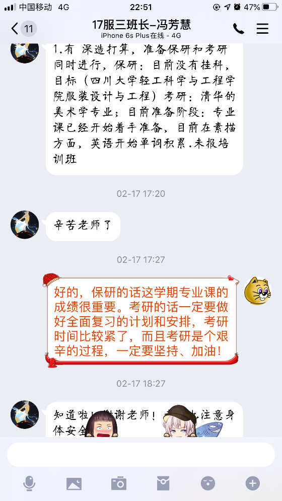 防疫期间,学院辅导员利用学生“宅”家空闲时间较多的时机,一对一的对大三学生进行深造规划指导与对大四学生的深造进度指导与就业跟踪,为提升学生核心竞争力奠定基础。