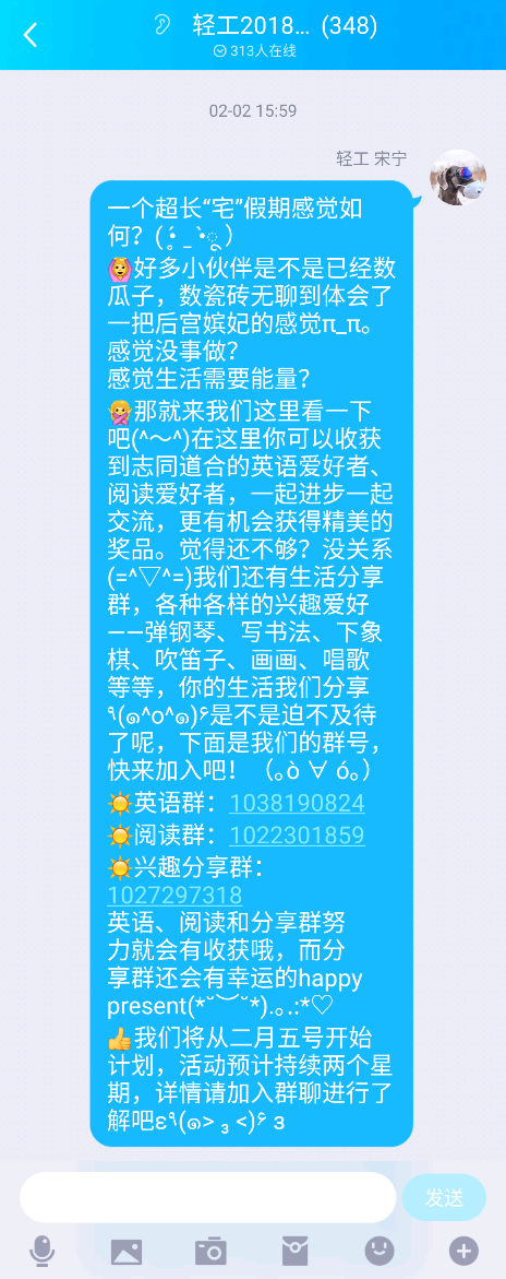 为丰富学院学生“宅”家生活,院团委和学生学术科技协会推出“成长·蜕变”主题系列活动。建立互助互享小组,通过兴趣分享、英语学习和三个线上阅读打卡群等方式帮助学生培养良好的学习生活习惯,为学生“宅”家生活添滋增色。