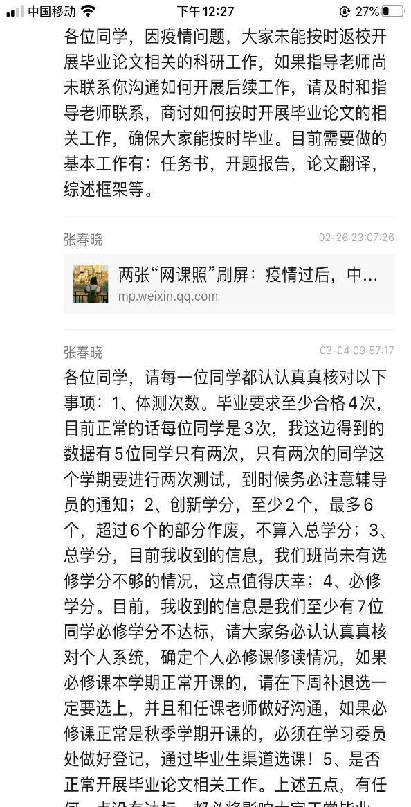 戴老师针对每个学生所思所感,逐一返回批注和建议,并精心准备疫情心得总结,发布在班级群,和同学们一起探讨,引导学生积极正向思维。