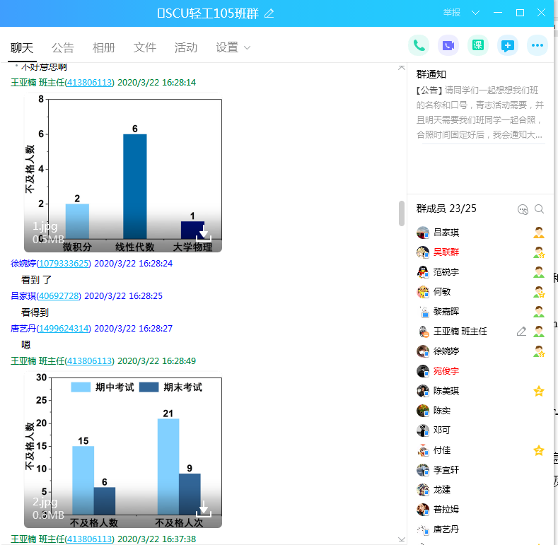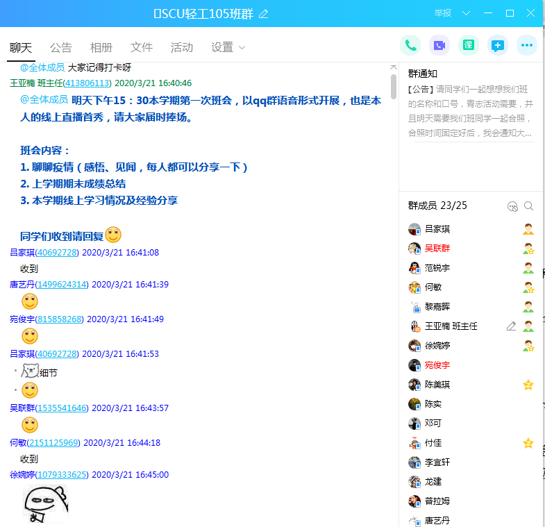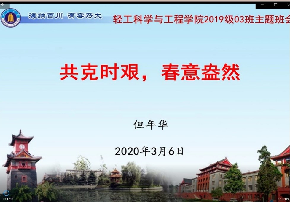 但老师这样的例子学院还有很多,王亚楠副教授担任本科生课程《制革概论》(全英文)线上教学工作,同时也是轻工类专业2019级105班班主任 。3月22日王老师组织全班同学召开线上班会,和同学们深入交流,一方面对上学期期末成绩总结,分析同学在年级的排名区间,敦促不及格同学好好准备补考;另一方面也关注学生成长,关注他们所思所想,每人线上分享疫情期间的感悟和见闻,最后对如何高效上网课王老师和学生们热烈讨论、交流分享,整个班级精神面貌和状态丝毫没有受到疫情影响。