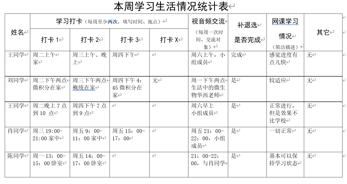 开学后,但年华老师担任研究生课程《生物学科学与工程导论》网络教学工作,发现网上上课有利有弊,那些2019级孩子们能不能适应网上教学,“宅家”怎么样安排好学习?这一直是他挂念、操心的事,简单的叮嘱学习,或是教孩子们一些学习方法,好像还缺少点什么?这样特殊时期,应该传递给学生什么呢?但老师心里不断思量着,反复计划着,最后于3月6号精心组织策划一场 “共克时艰,春意盎然”主题班会,意在增强班级凝聚力。但老师首先向同学们介绍了新冠肺炎疫情状况,强调国家政策,嘱咐孩子们“宅家”做好防护,提醒他们做好学习规划。针对上学期学生学习情况,为更好相互督促鼓励,但老师将全班分成4个学习小组,以小组细化管理,在小组内部开展学生间视频语音交流活动和网上学习打卡,要求每周“沉浸式”学习至少1—2小时,每位同学填写《本周学习情况统计表》,由组长收集,班长汇总后交给班主任。此外,每两周开展一次主题班会,通过网上开展形式多样的集体活动,增强班级凝聚力。