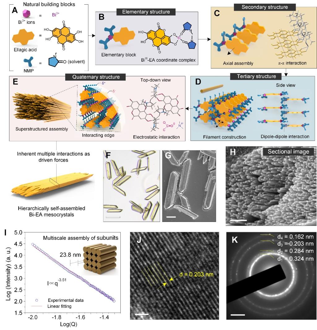鞣花酸(EA)是天然多酚类小分子化合物,主要存在于水果、蔬菜和树皮中。该工作将EA与铋离子(Bi3+)络合,形成具有有序四级结构的金属-多酚晶体(Bi-EA mesocrystals)。小角度X射线散射和模拟计算揭示了层级自组装的过程:Bi-EA络合物作为一级结构通过EA分子间相对较强的π-π作用延伸为超分子线二级结构,二级超分子线进一步通过溶剂分子间的偶极作用组装成三级结构的纳米纤维,纳米纤维进一步通过静电作用堆叠成高度有序的微米级晶体(四级结构)。这种具有多层级自组装特性的生物质植物多酚是除DNA和多肽外的一类新的天然自组装基本单元,该工作为复杂微-宏观复合材料和高性能的器件提供了一种新的简单的制备方法。