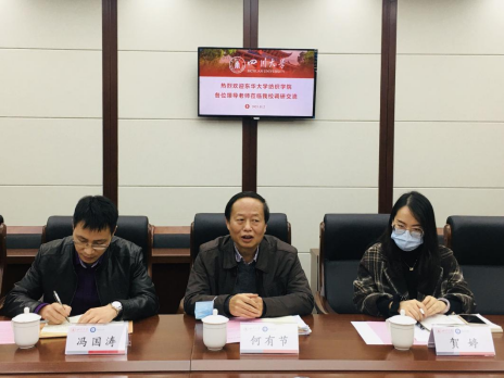 何有节院长代表学院对陈志刚副书记一行表示热烈欢迎,并回顾了与东华大学相关院系交流合作的渊源,希望东华大学纺织学院与我院进一步加强交流与合作,共同为新工科人才培养出谋划策。