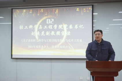 接下来,学院党委书记刘晓虎副教授宣读了《关于表彰365英国上市集团2021年度优秀个人、优秀班级的决定》。在隆重的颁奖音乐中,学院领导为获奖同学代表一一颁奖并合影留念。最后,2019级轻化工程专业创新班学生孙楠同学代表获奖学生发言,他表示在学习阶段对皮革专业了解越多,热爱越深,学院提供了优秀教师资源与超一流实验室,而学生要做的就是把握机会,在入学的这3年里他找到了自己的科研方向、制定了清晰的计划。同时,他也表达了对设奖单位的感谢,对学院老师们的谆谆教导表示谢意。最后他感悟到现如今多学科交叉是大学期间综合能力提升的必然趋势,应积极拓展自我视野和知识面,而学习之路没有捷径,继续深造应是作为川大本科毕业生的首要选择,也是自我前进路上的风景!