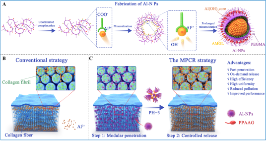 基于以上科学发现和理论认知,为实现对皮胶原纤维的精准、高效、均匀地化学交联改性,受生物矿化启发,我们与德国马普所陈朝见博士合作首次设计了高分子聚合物与三价铝离子通过“原位矿化—超分子自组装”制备了一种清洁化的载铝复合纳米粒子(Al-NPs);利用其惰性聚乙二醇纳米表面、纳米尺寸、酸性pH敏感性的协同作用,智能执行“模块化渗透-控制释放”策略,获得了比传统金属离子更高效和均匀的交联改性效果(图2)。这一研究成果已被国际知名材料期刊Materials Horizons(影响因子IF 13.2)接收并在线发表(Mater. Horiz. 2022, DOI: 10.1039/D1MH01965A,我院硕士研究生朱瑞鑫为第一作者,刘公岩教授、陈朝见博士为通讯作者)。
