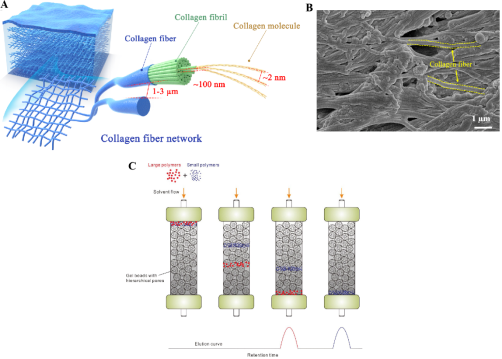 图1、大分子纳米材料在多层级胶原纤维网络中的类“凝胶色谱尺寸排阻”渗透行为