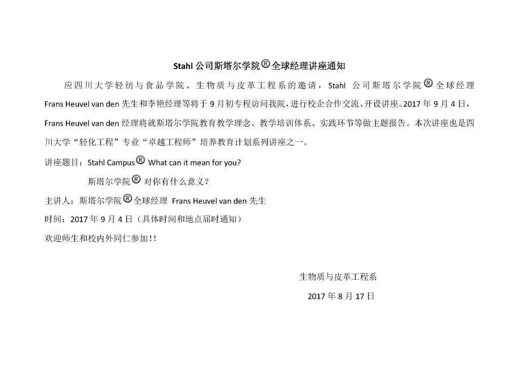 Stahl公司斯塔尔学院全球经理讲座通知