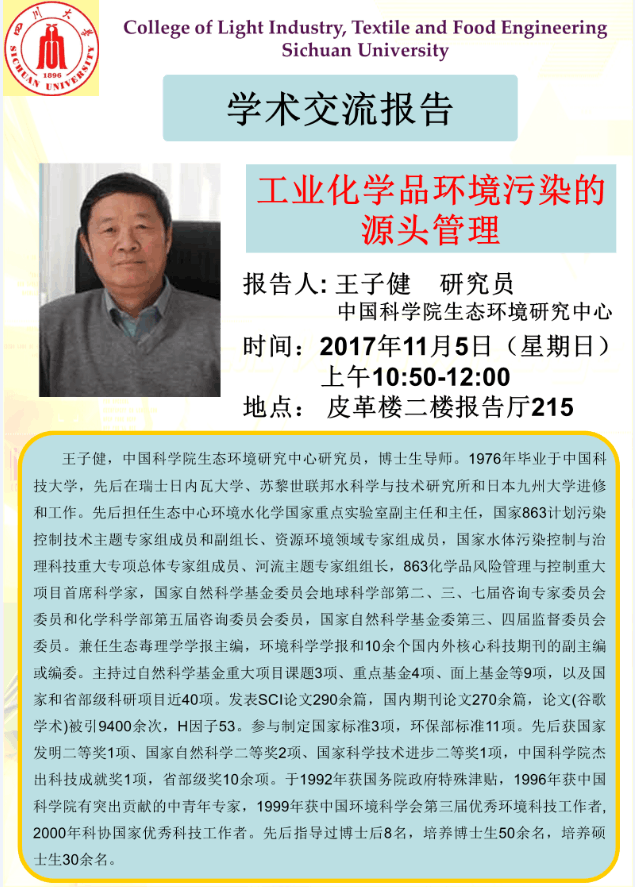 报告题目:工业化学品环境污染的源头管理报告人: 王子健 研究员 中国科学院生态环境研究中心时间:2017年11月5日(星期日) 上午10:50-12:00地点: 皮革楼二楼报告厅215