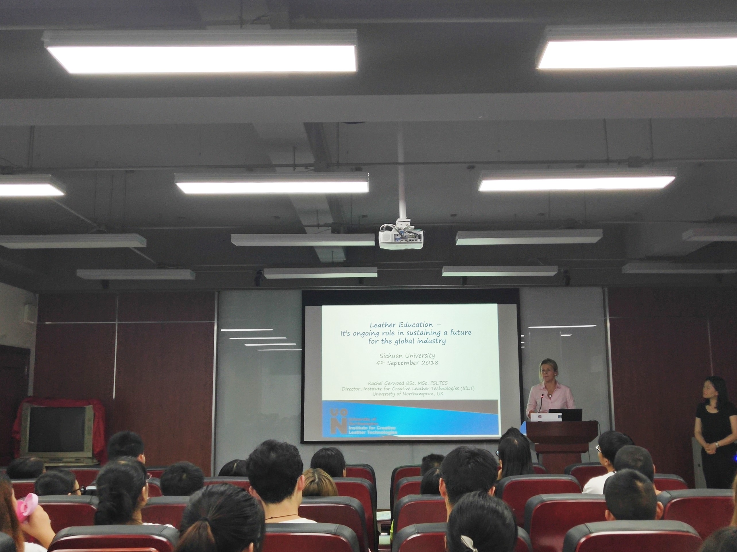 2018年9月4日晚,我院与英国北安普敦大学、斯塔尔公司联合报告会于皮革楼215报告厅如期进行。本次讲座报告人为英国北安普敦大学皮革技术创意研究院负责人Rachel Garwood、斯塔尔公司可持续发展及斯塔尔学院负责人Michael Costello以及斯塔尔公司广州GTC实验室经理李艳。轻纺与食品学院院长何有节教授为本次讲座的嘉宾,我院2015、2016级辅导员和轻化工程专业学生到场参加了活动。