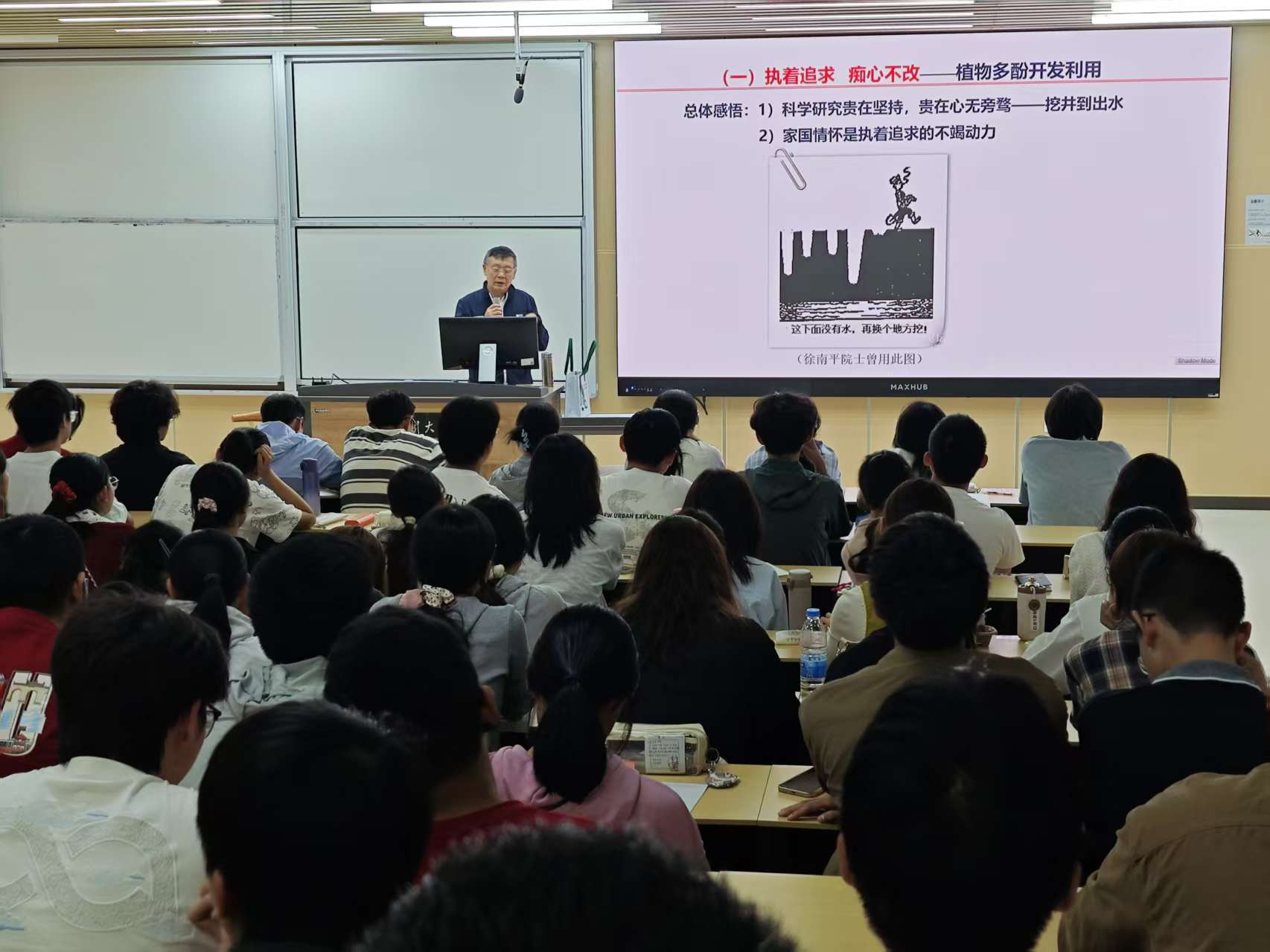 课堂上,石碧院士没有讲授深奥的理论,而是从自身经历出发,娓娓道来。他首先分享了博士初期三年始终“执着追求,痴心不改”的阶段,强调基础积累与心态调整的重要性,让同学们认识到科研道路上坚持的宝贵。随后,他讲述了如何用六年时间将博士阶段的成果推广应用,又用长达十一年的潜心研究攻克遗留难题,这一“锁定目标前行,沿途产出成果”的经历,向新生们清晰地展示了系统性科研的路径。