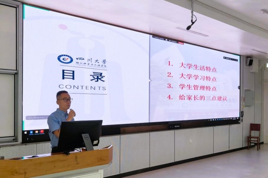 院长彭必雨教授从学院的办学历程、师资队伍及人才梯队、学科专业设置与发展沿革、组织架构及平台资源等方面,向全体新生家长详细介绍了校院基本情况。彭院长指出,学院为广大学子提供了一流的学习成长环境与优质育人资源,期望他们成长为具备国际视野与创新能力的栋梁之才;同时,鼓励家长主动参与孩子成长,家校携手为其未来发展夯实基础。