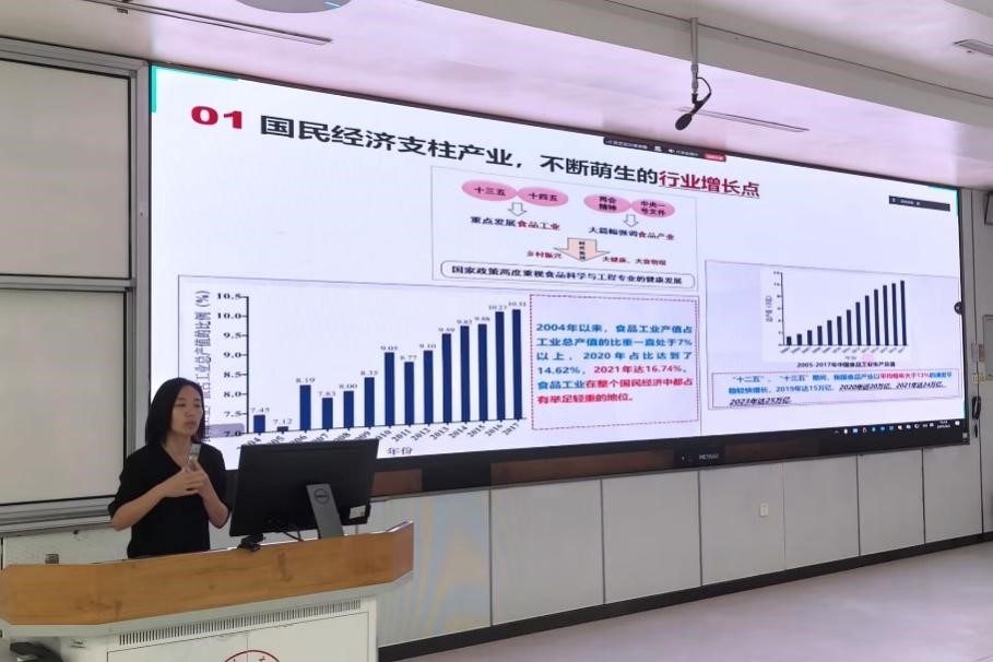 食品工程系段飞霞副教授从行业价值与专业优势展开分享。段飞霞副教授介绍,食品工业作为国民经济支柱产业,正加速向智能化、绿色化、健康化转型,学院紧扣产业需求,依托一流平台与国际化培养体系,在全产业链升级领域成果突出,为学生搭建起对接行业前沿、明晰学业与职业规划的广阔路径。