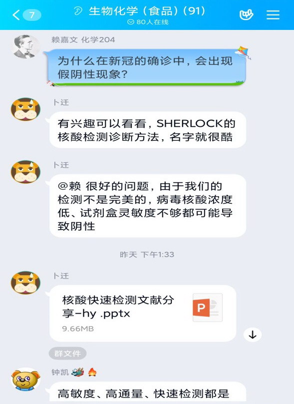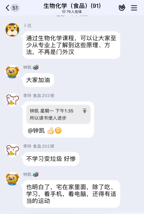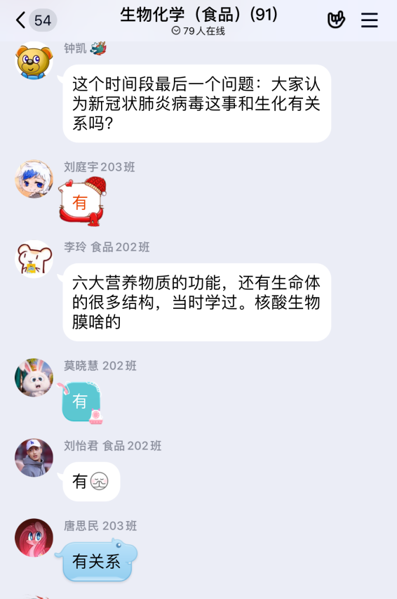 有效启发学生创新思维,不仅是课堂教学肩负的责任,更是当下亟待解决的难题。任课教师们把当前的社会热点有效融入授课内容,通过深挖热点现象与专业知识之间的联系,引导学生积极拓展思维空间。《食品生物化学》任课教师钟凯副教授、卜迁副研究员依托MOOC和腾讯课堂,在课程内容中融合新冠病毒的相关知识,引导学生打开思考的阀门,激发学生的学习兴趣和对专业的认可度。