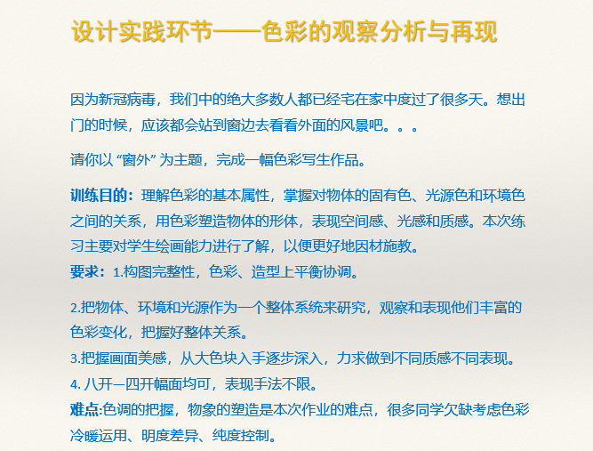 《表现色彩》任课教师姚云鹤老师利用腾讯会议的屏幕分享功能进行课堂讲授,并辅以课前会议、在线问卷调查等环节增添教学的互动性。在助教的协助下开展分组讨论,师生互动活跃,提升了整体教学效果。课间播放精心挑选的音乐,让大一新生在愉悦的氛围里享受学习的乐趣。