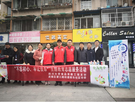 为深入贯彻“不忘初心、牢记使命”主题教育精神,以实际行动践行初心和使命,20191127上午,食品教工党支部联合武侯区望江路街道棕东社区党委开展了一次以“不忘初心、牢记使命”为主题的志愿服务活动。本次活动旨在普及食品安全科学知识,促进民众踊跃参与食品安全共建、共享和共治,切实保障人民群众“舌尖上的安全”。