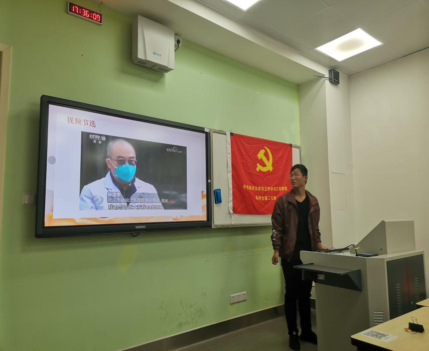 第二小组党员代表曹赛超同志以抗疫一线的党员同志,尤其是医务工作群体先进事迹和与会人员做了分享。曹赛超同志指出医务工作者中的党员与死神较量,用生命守护生命,是战“疫”中涌现出来的最靓丽的风景,他们是“最美逆行者”,也是最可敬的一群人。曹赛超同志表示我们青年一代要坚定理想信念,加强专业技能学习,用实际行动引领成长,指导实践。