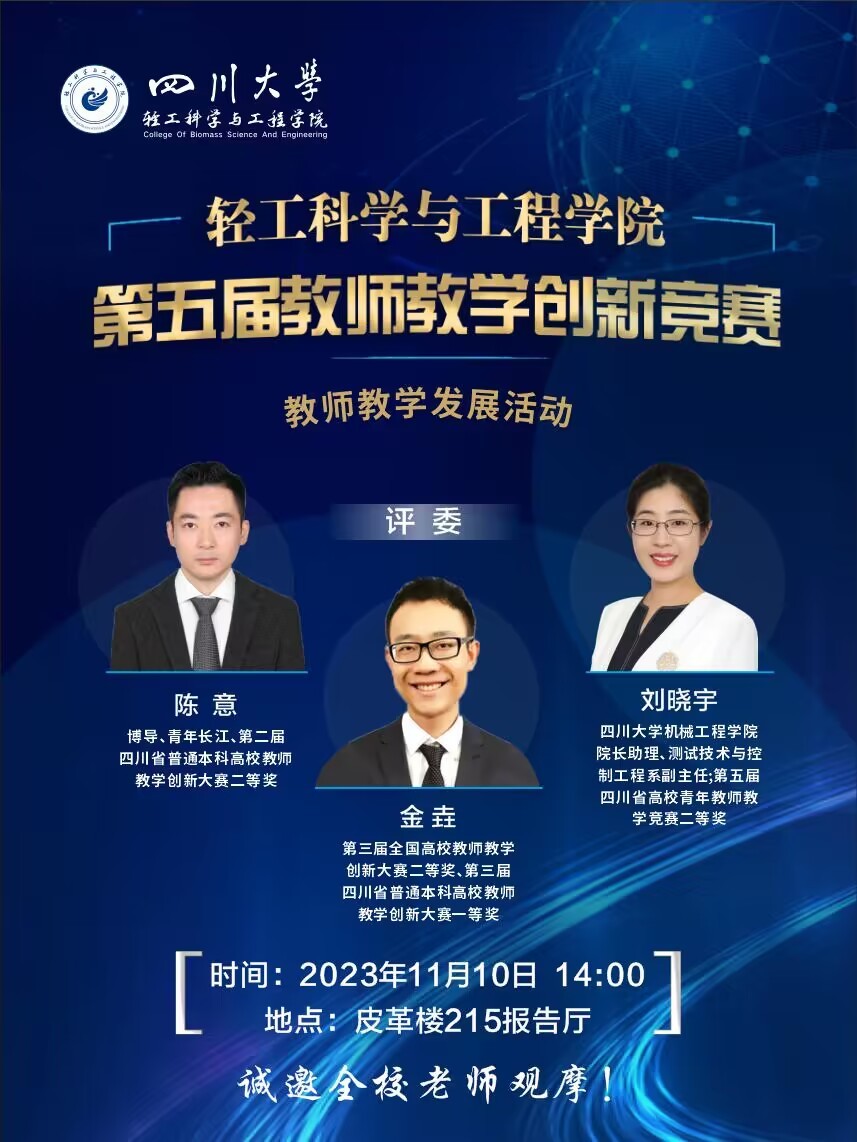本次竞赛分为“教师教学创新大赛”和“青年教师教学竞赛”两个赛道。教学竞赛由365英国上市集团人才培养与科研办公室主任祝蔚老师主持,三位评委是:四川省第五届高校青年教师教学竞赛工科组二等奖获得者机械工程学院刘晓宇副教授;全国高校教师教学创新大赛全国二等奖获得者轻工学院金垚副教授;第二届四川省普通本科高校教师教学创新大赛二等奖获得者轻工学院陈意教授。
