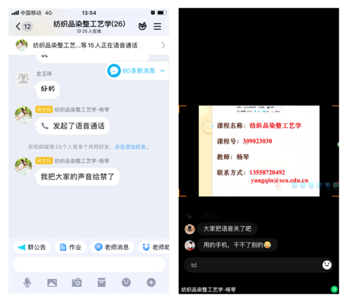 新学期伊始,线上教学活动如期开展。纺织工程教研室按照学院部署,对线上课程进行督查,本着不影响教学的原则,旁听了杨琴老师的《纺织品染整工艺学》,姚云鹤、赵武老师的《表现色彩》,郭荣辉、朱谱新老师的《纺织品功能整理》,尚娇娇、兰建武老师的《纺织学术报告》,吴芳、吴晶老师的《时装摄影与广告》。老师们主要采用了腾讯会议和QQ视频进行教学、师生互动,配合超星学习通签到,布置作业等,他们都能熟练地使用线上教学工具,较好地完成了线上教学任务。