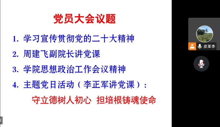 为深入学习宣传贯彻党的二十大精神,皮革教工党支部于2022年12月27日召开了支部党员大会。本次党员大会采用线上方式进行,副院长周建飞同志和支部书记李正军同志讲授了专题党课。