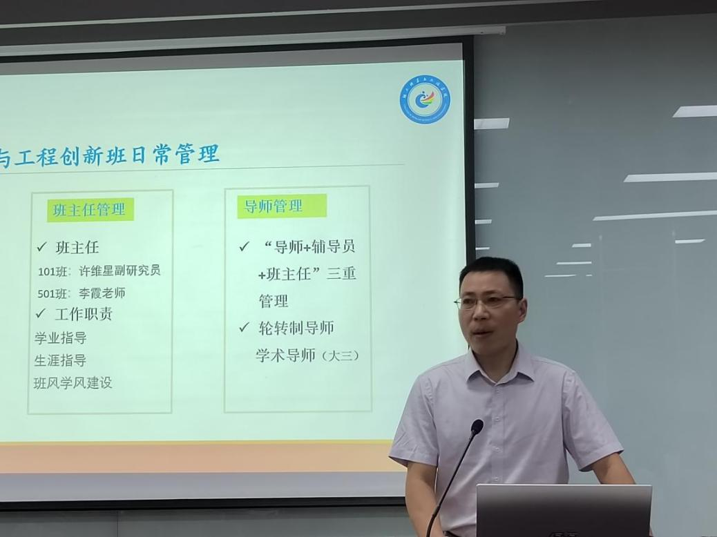 随后,冯国涛副书记宣讲了创新班学生管理方案,并详细介绍了创新班往届学生在创新能力、深造能力等核心竞争力方面取得的优异成绩,大大鼓舞了2022级创新班学生的士气。陈意副院长和尚娇娇老师对创新班培养方案和轮训要求进行了宣讲,希望创新班同学们继续保持优秀、锐意进取,在新平台、新赛道上勇往直前,不断取得新突破、新成绩。