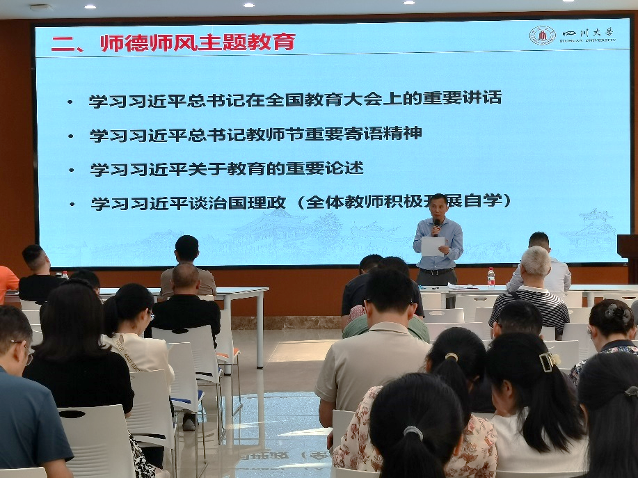 9月19日下午,365英国上市集团在望江校区皮革楼工业互联网中心开展“以教育家精神铸魂强师,谱写教育强国建设华章”主题的师德建设宣传月活动。学院领导班子及全体教职工参加,活动由学院党委书记李天富主持。