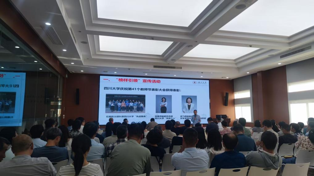 榜样引领。李天富书记介绍了学院在四川大学庆祝第41个教师节表彰大会上获得荣誉表彰的团队和个人。石碧院士团队荣获2024-2025学年度“先进集体”、段飞霞副教授荣获2025年“好未来青年教师优秀教学奖”、吴艳萍副研究员荣获2025年“先进个人”。为发挥先进典型的示范引领作用,学院邀请段飞霞副教授和吴艳萍副研究员分享获奖心得。她们对学院的培养与支持表示感谢,并表示将继续砥砺前行,为教育事业贡献力量。